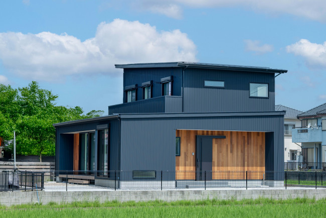 クールな印象を与えるガルバリウム鋼板の外壁も、夏の空との相性は抜群。