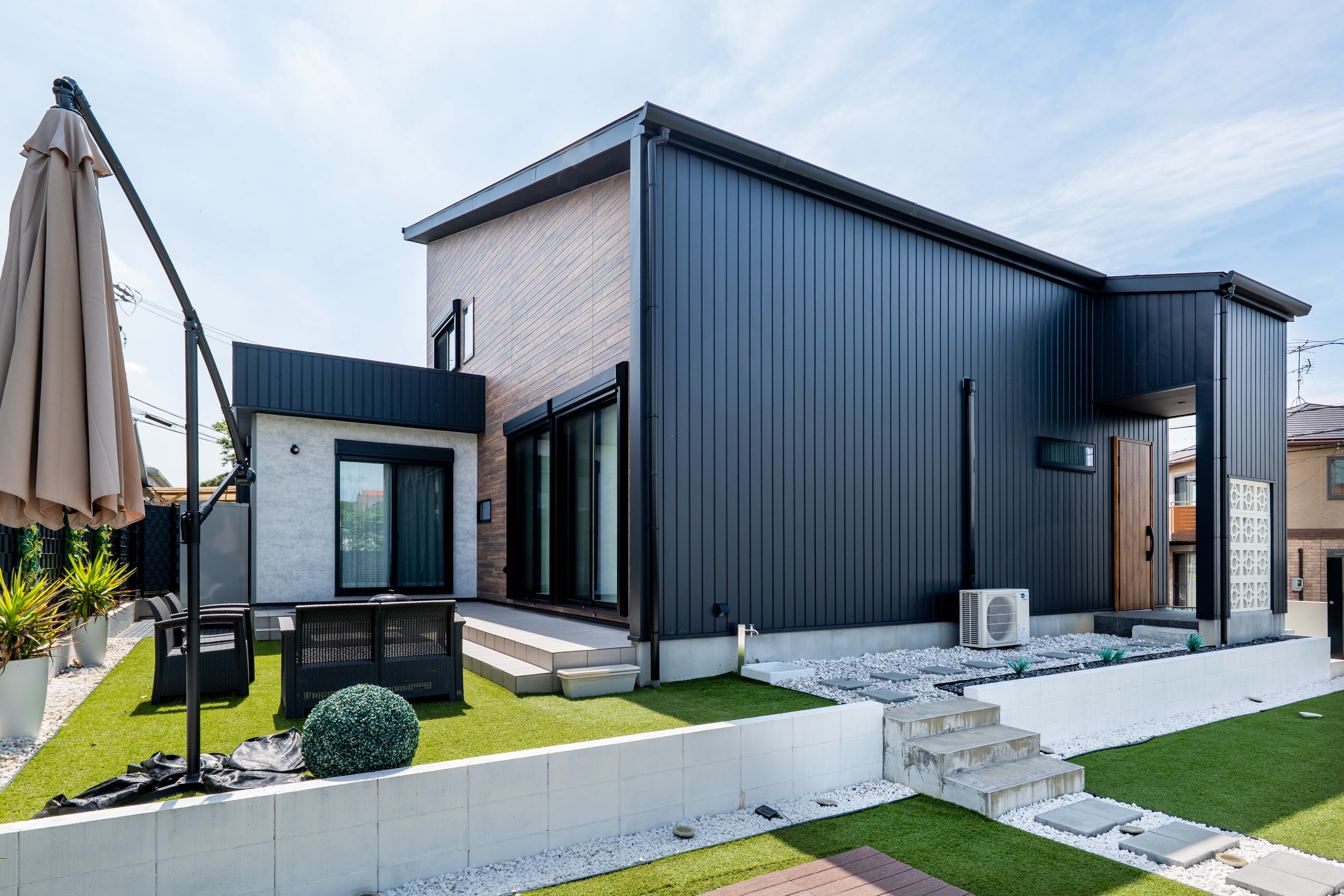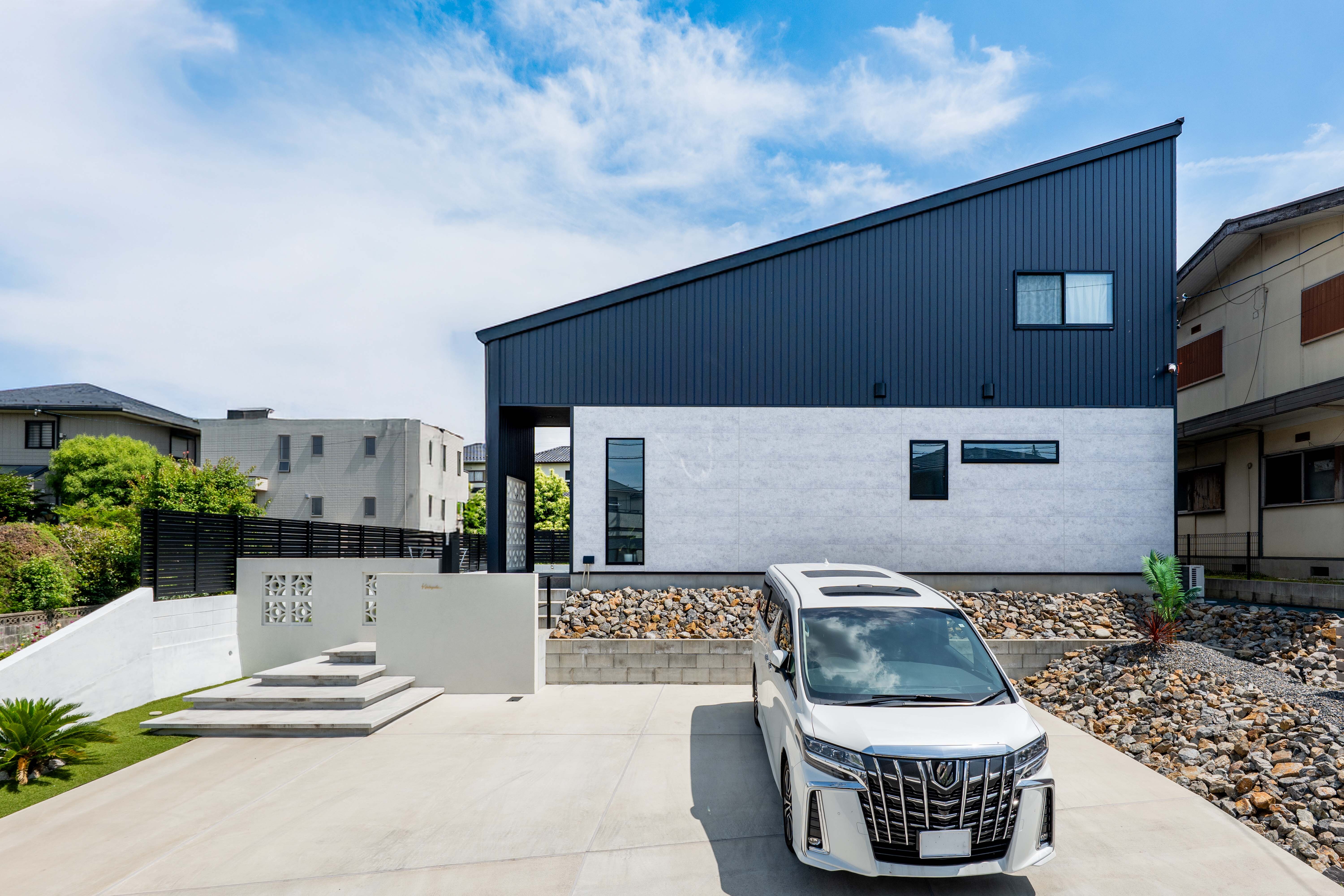 白の石目とグレーのガルバが織りなす上質なツートーン。花ブロックが陽の光をやさしく通す、片流れ屋根の家