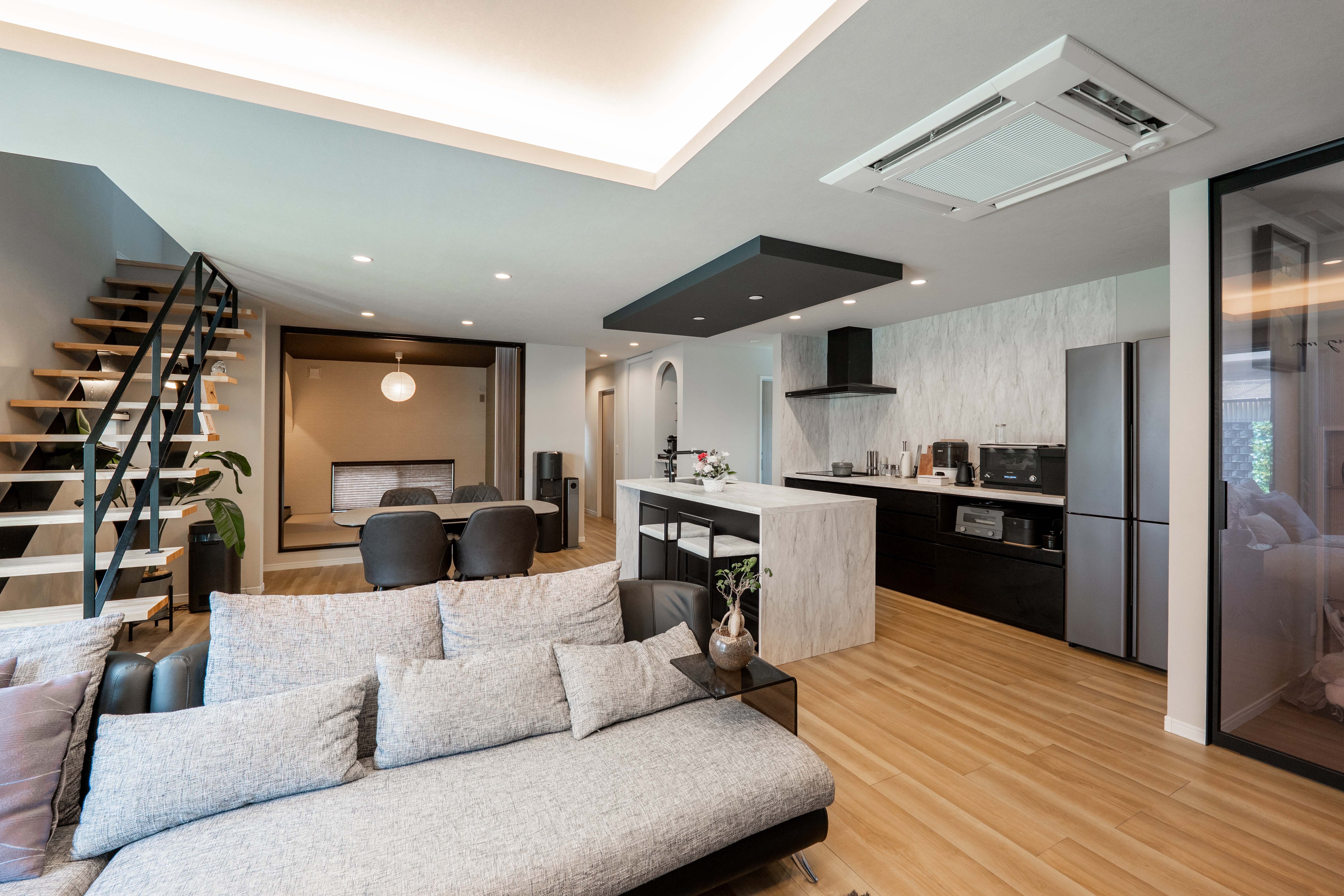 28畳の広々LDKに、折り上げ天井が開放感をプラス。リゾートのようなくつろぎ空間がここに。