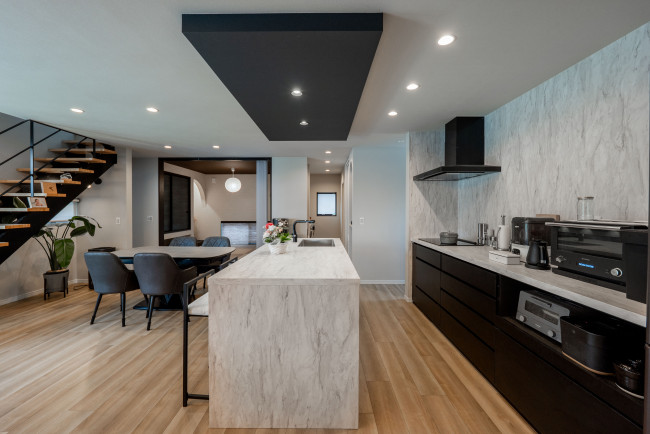 白の石目調が美しい、オーダーメイドのⅡ型キッチン。カウンターとの一体感が、上質な空間を演出します。グレーの折り下げ天井が、空間にさりげないアクセントと奥行きをプラス