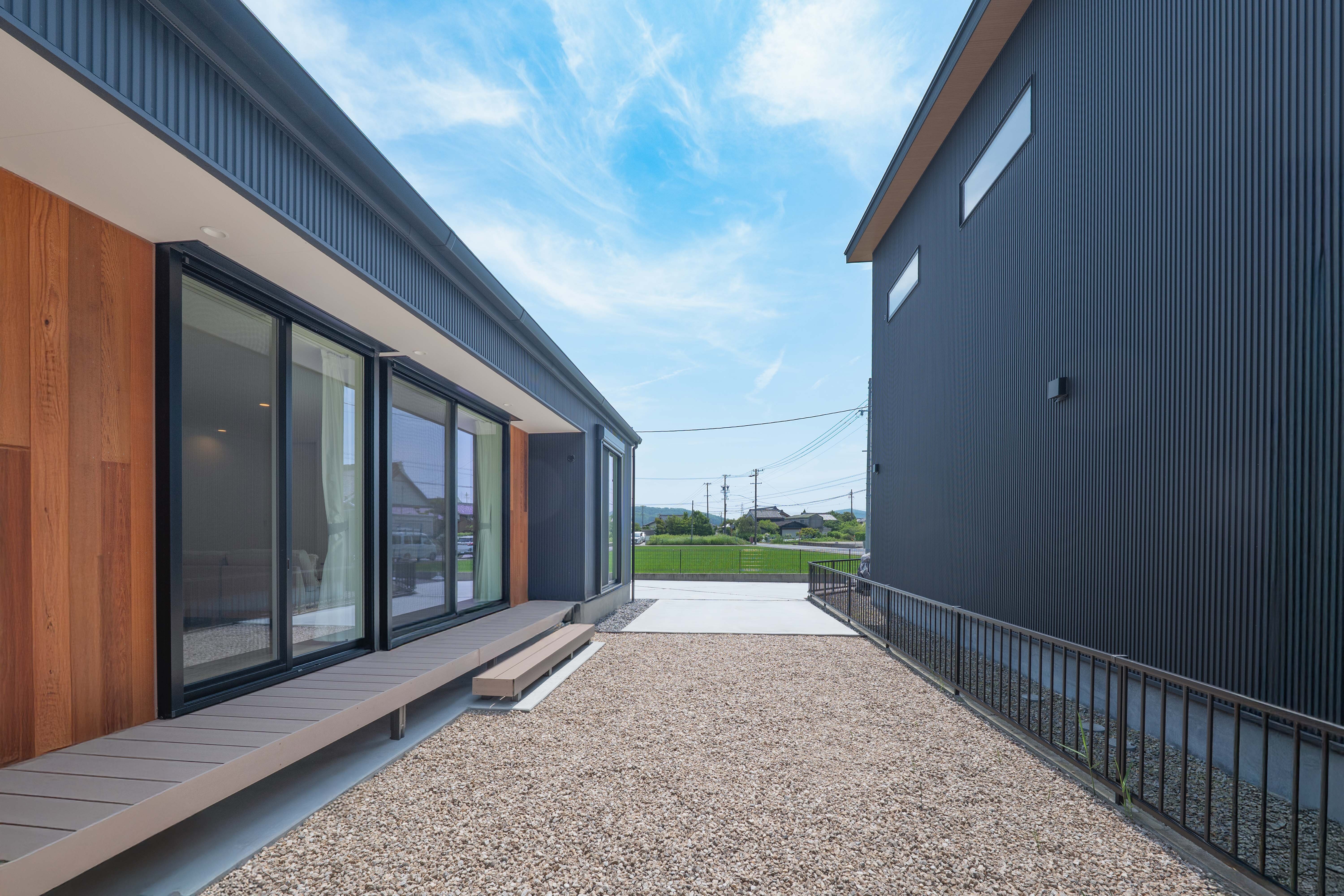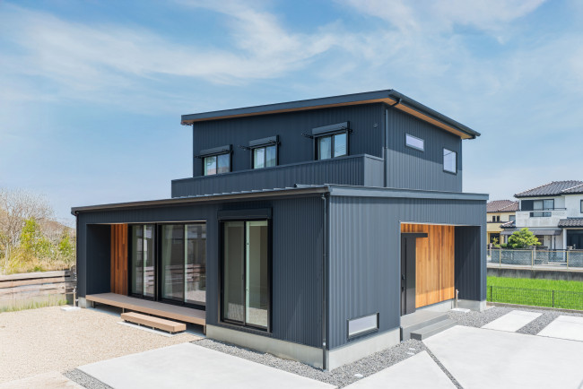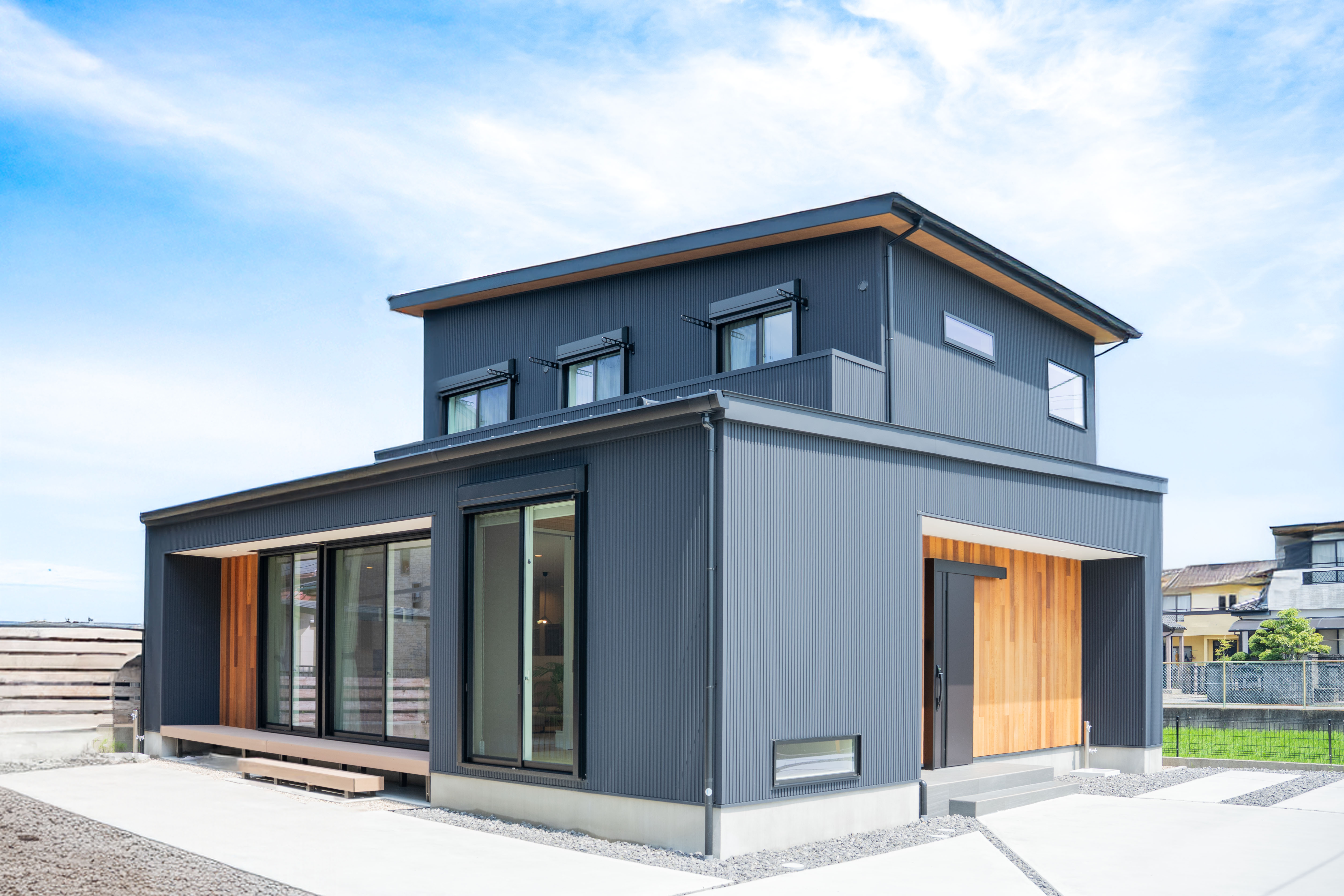 ガルバリウムのクールな質感とレッドシダーの柔らかな温もりが調和した外観デザイン。ジャパンディの心地よさを感じる、洗練された住まいを演出します。