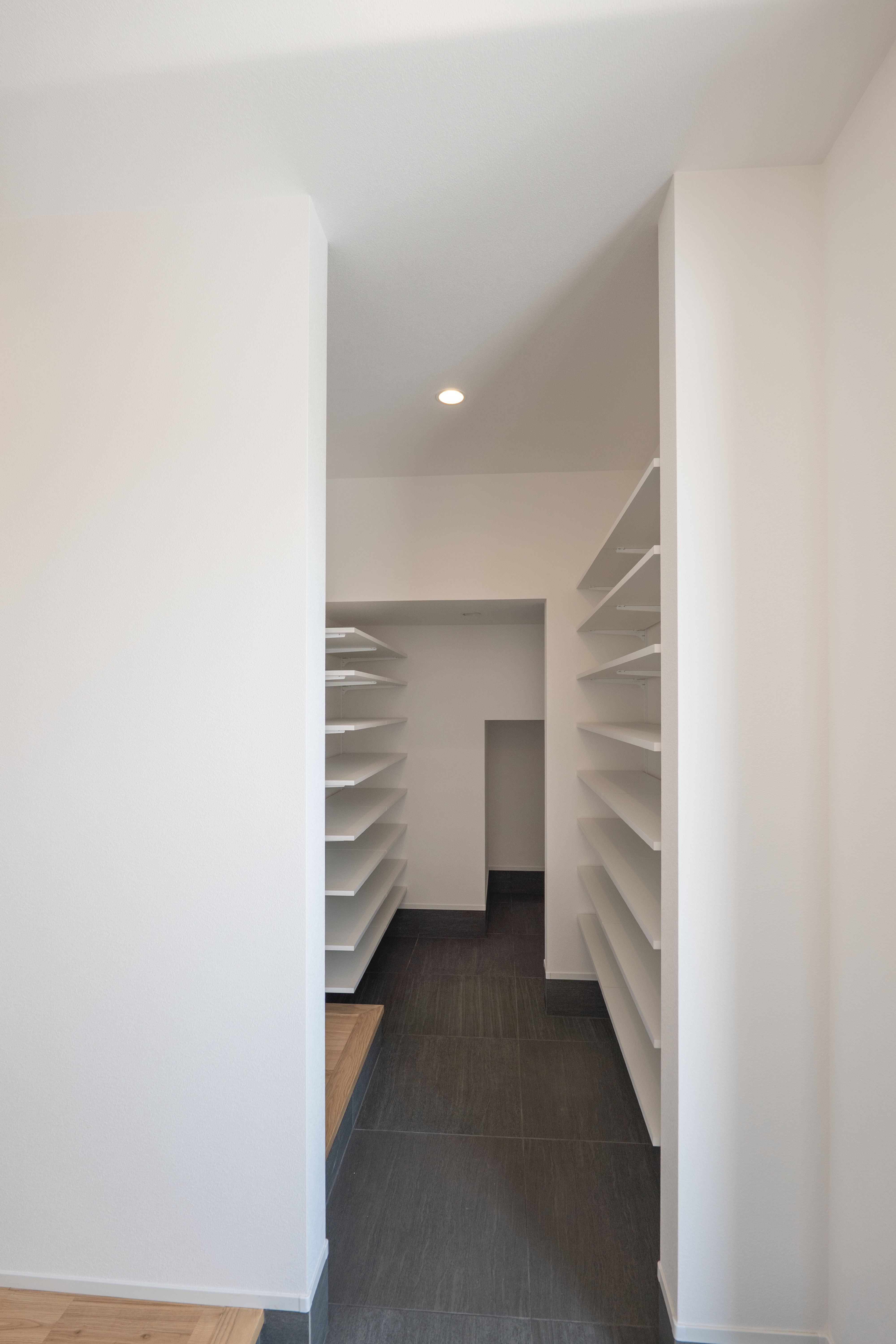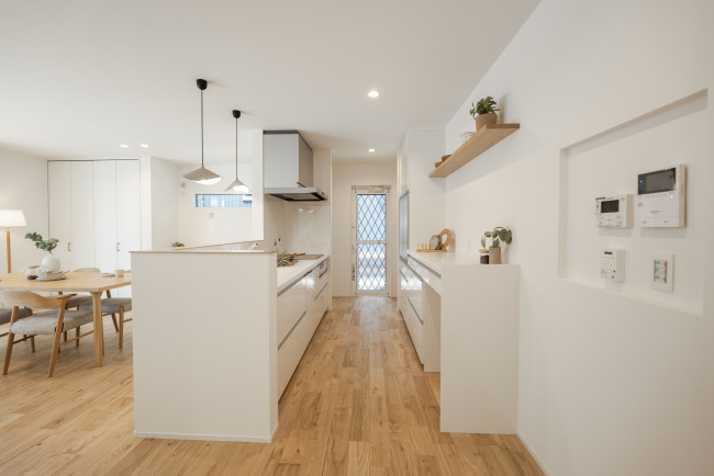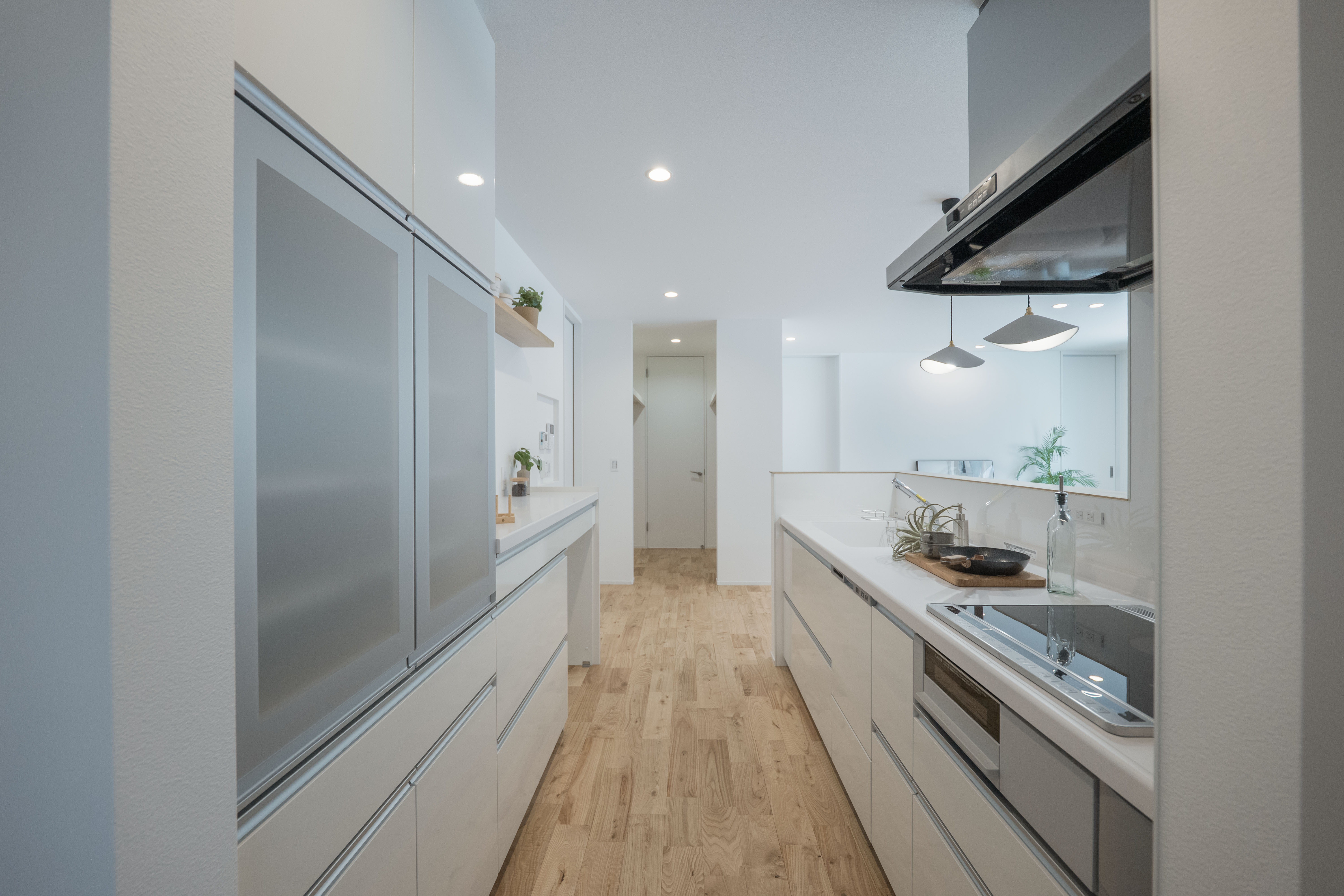 白を基調とした明るいキッチン。背面には大容量の収納があり、奥にはパントリーを配置。日々の家事をスムーズにし、すっきりと整った暮らしを叶えます。