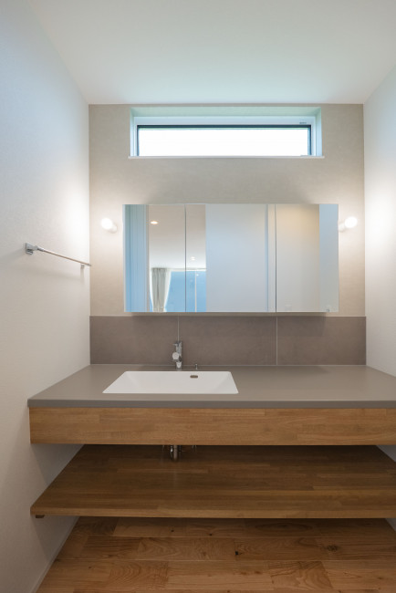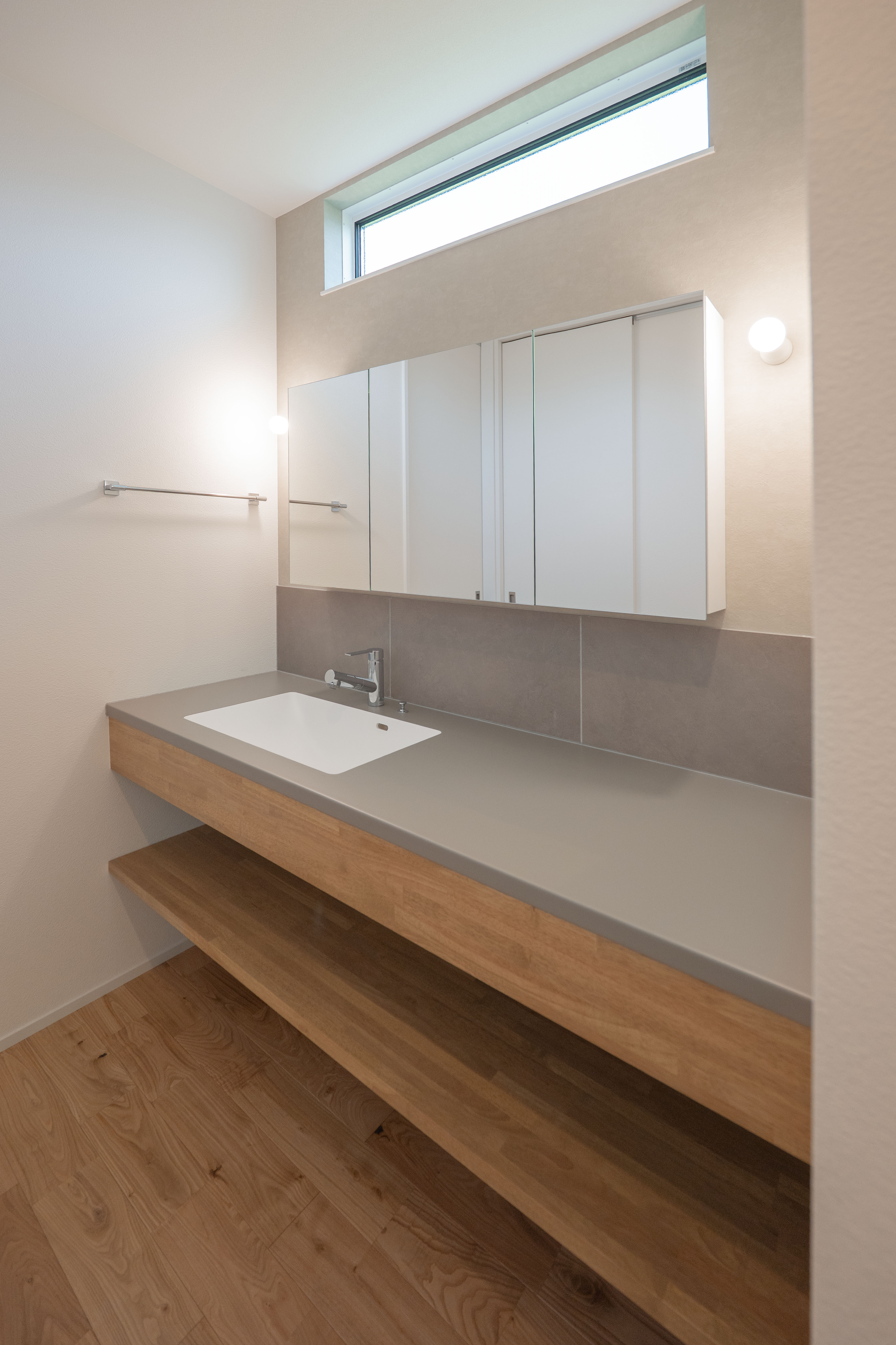 広々としたカウンターが特徴のオリジナル洗面台。シンプルで上質なデザインに木の温もりをプラスし、朝の身支度や家族での使用も快適に過ごせる空間を実現しました。