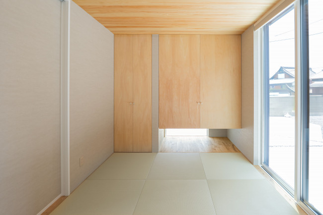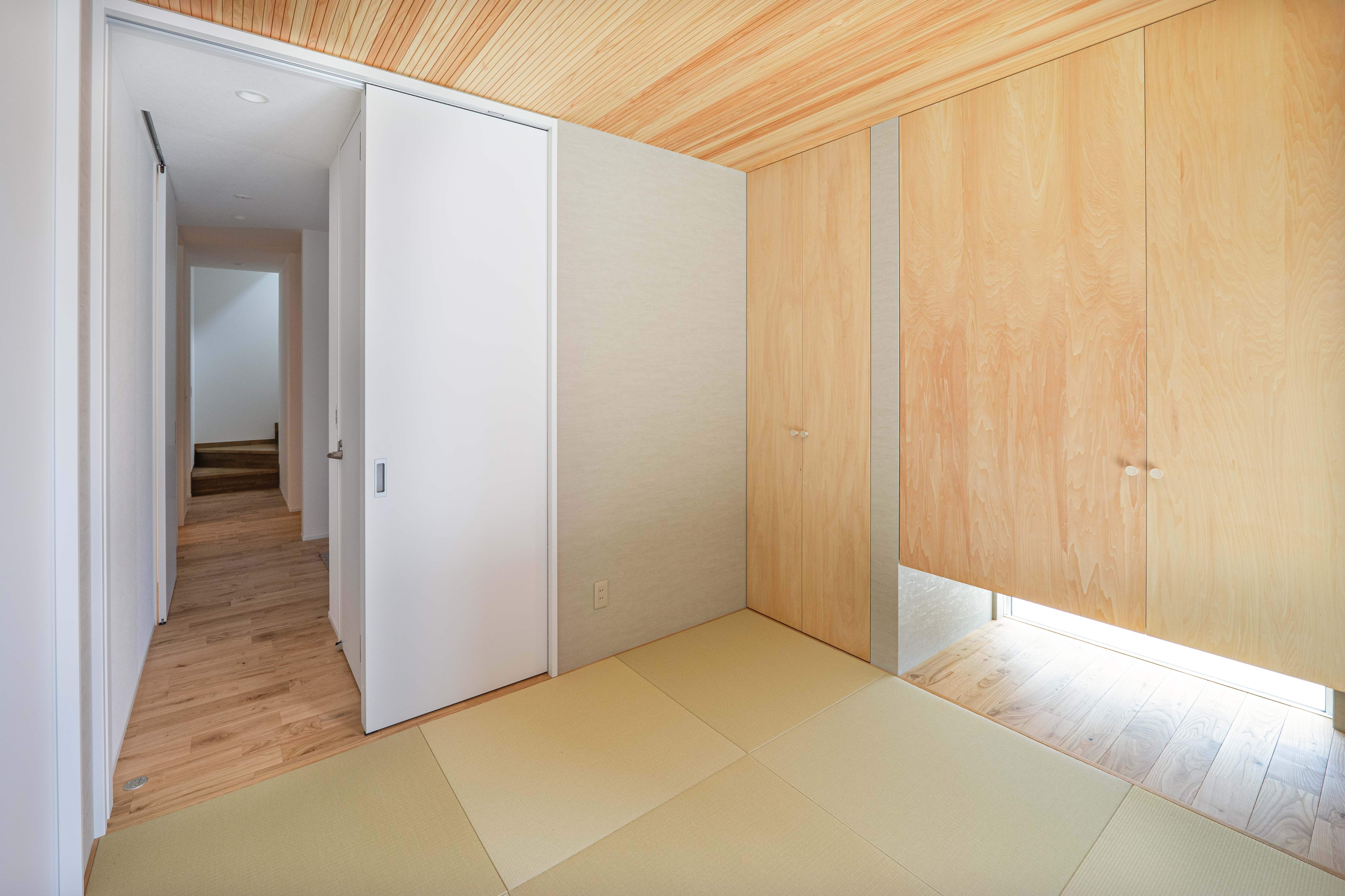 琉球畳が敷かれた落ち着きある和室。天井には檜のリブ柄を採用し、木の香りと温もりを感じられる空間に。奥様のお着物が美しく収まるように設計したオリジナル造作収納が魅力です。