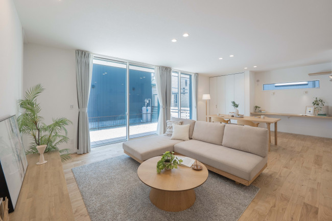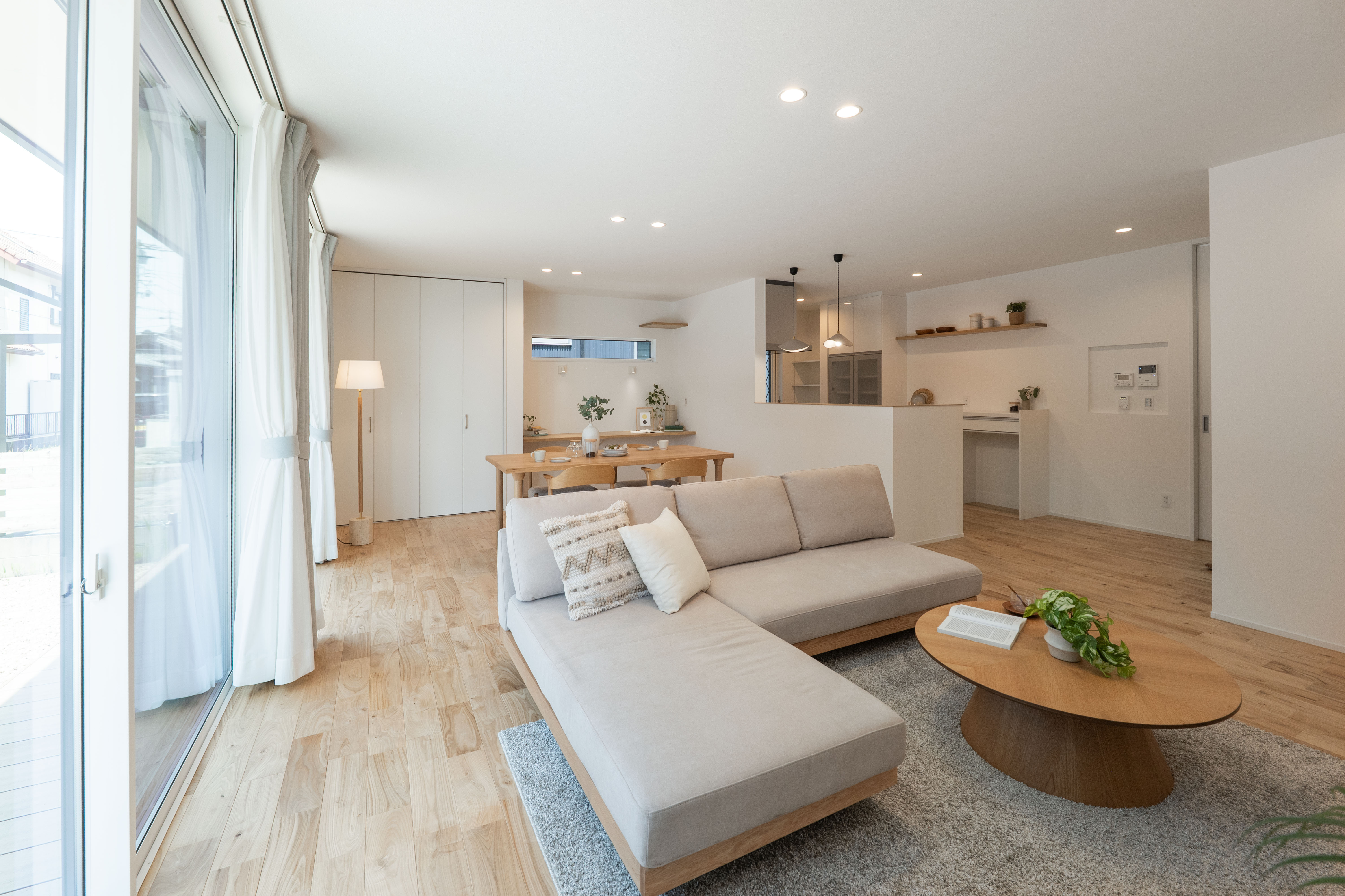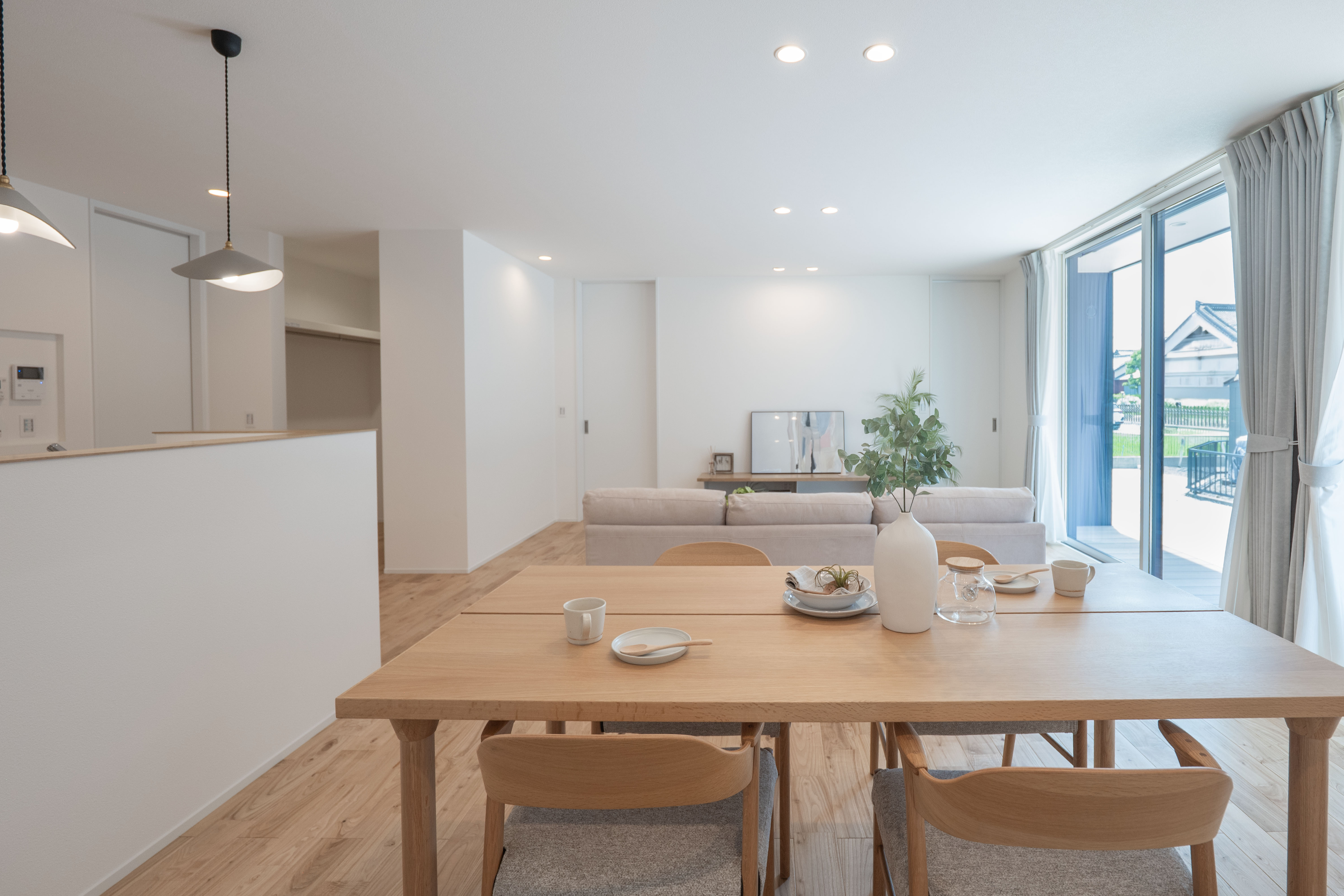 無垢材ならではのぬくもりに包まれる24.75畳のLDK。大きな窓から降り注ぐ光が空間をより広く、明るく演出し、家族が自然と集まる心地よい住まいを叶えます。