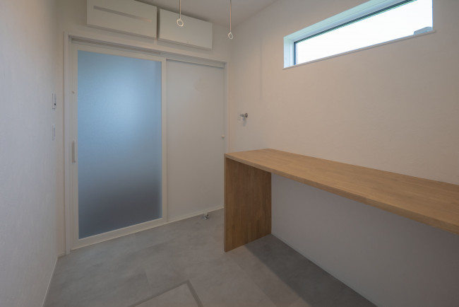 オリジナルのカウンターを備えたランドリールーム兼脱衣所。洗濯物を広々とたためるスペースがあり、家事の効率を高めながら快適に使える工夫が詰まった空間です