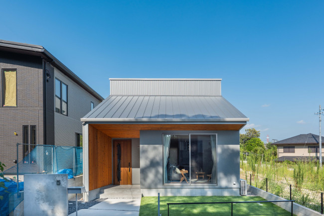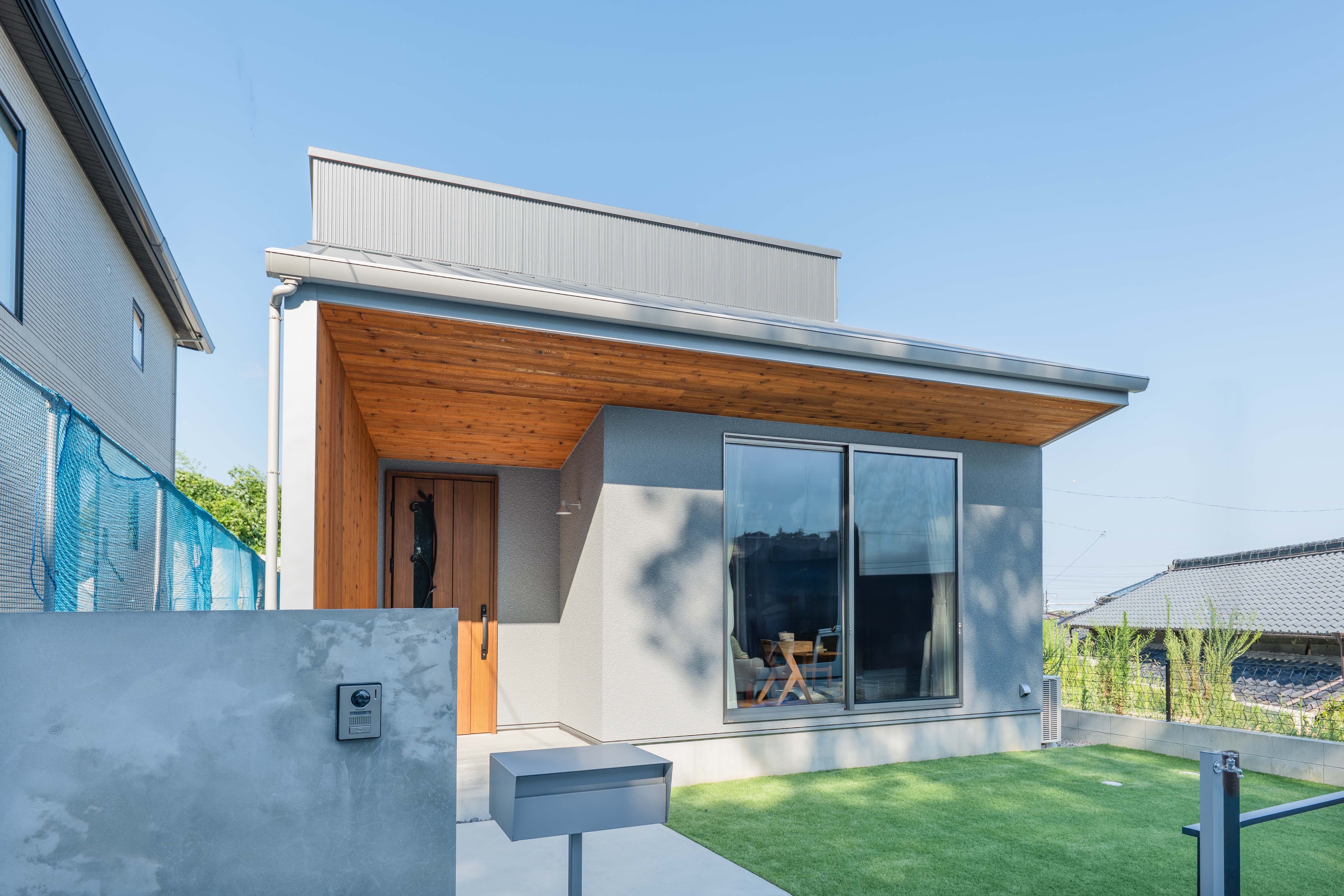 シルバーのガルバに本物の木をアクセントにした、洗練と温もりを感じる2階建住宅。