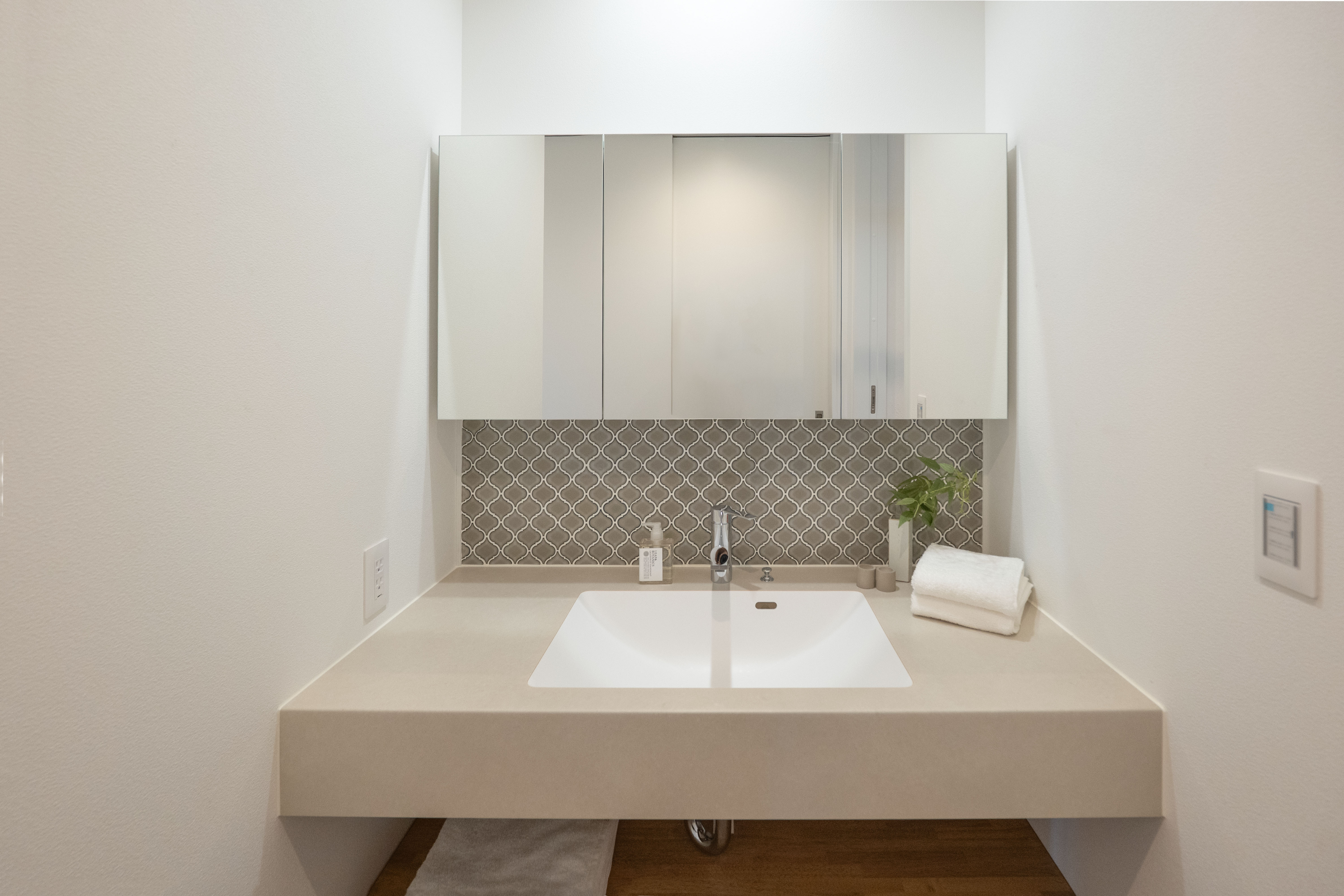 可愛いタイルをあしらった造作洗面台。毎日の身支度を心地よく彩るオリジナルデザイン