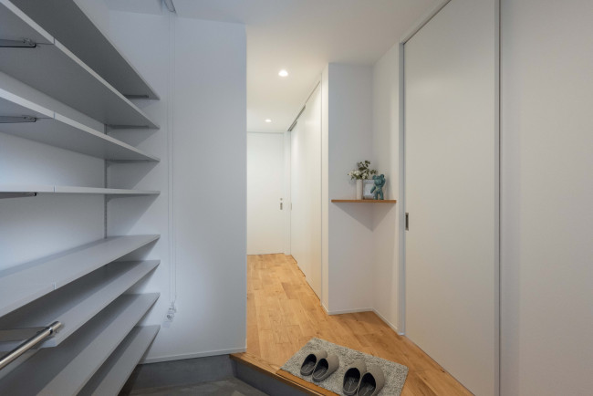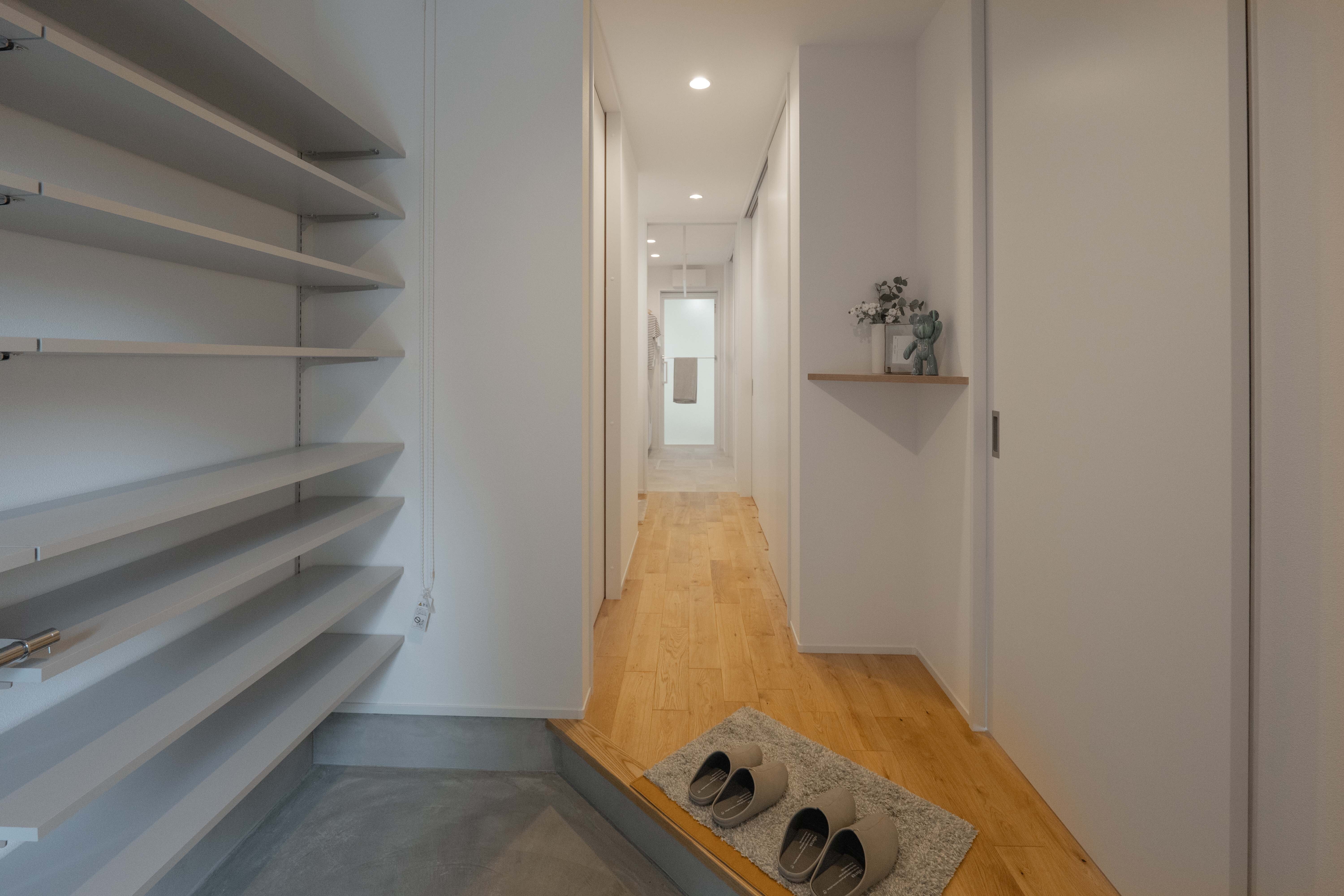 玄関からランドリールームまで一直線。省スペースなのに大容量のシューズ収納で快適に