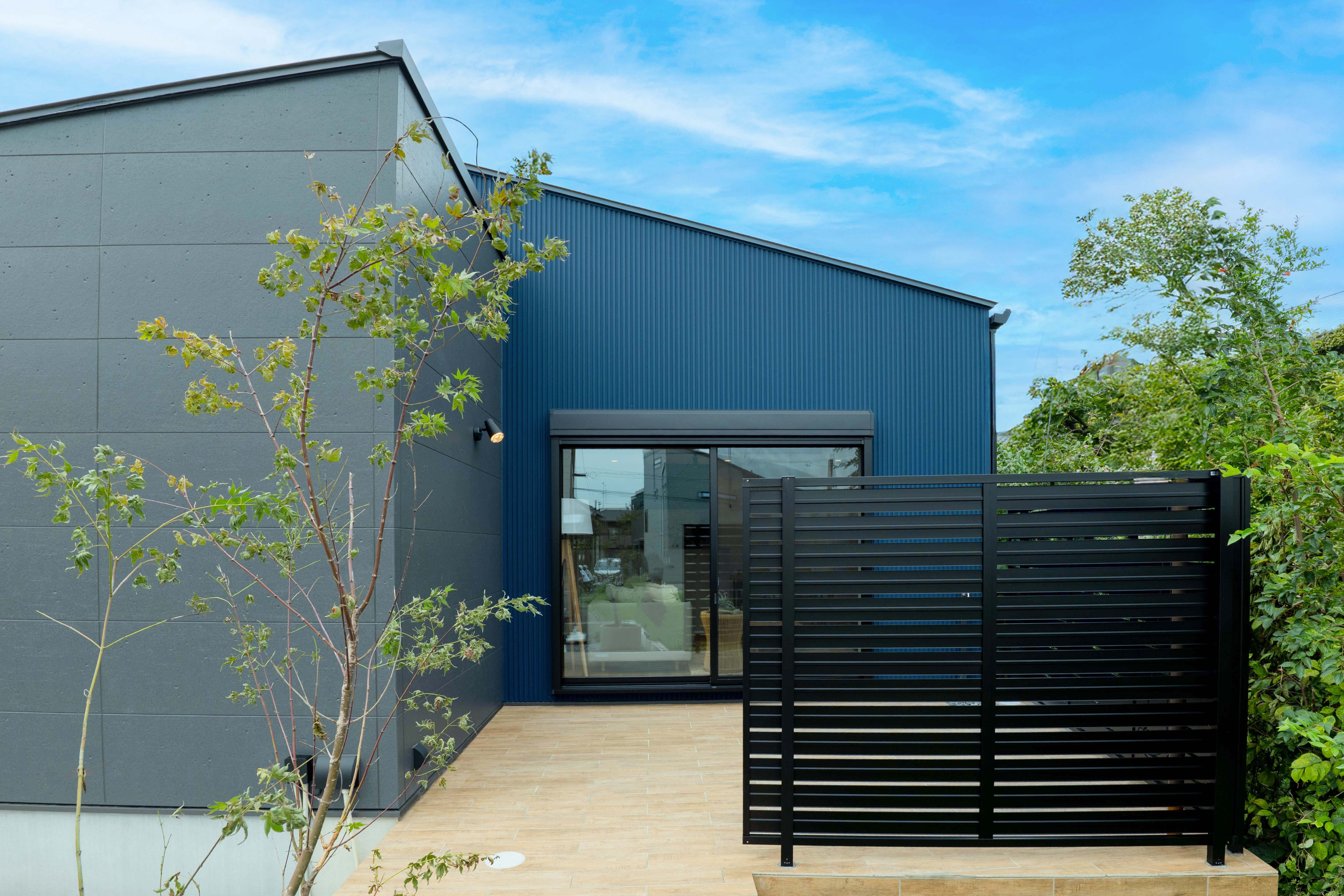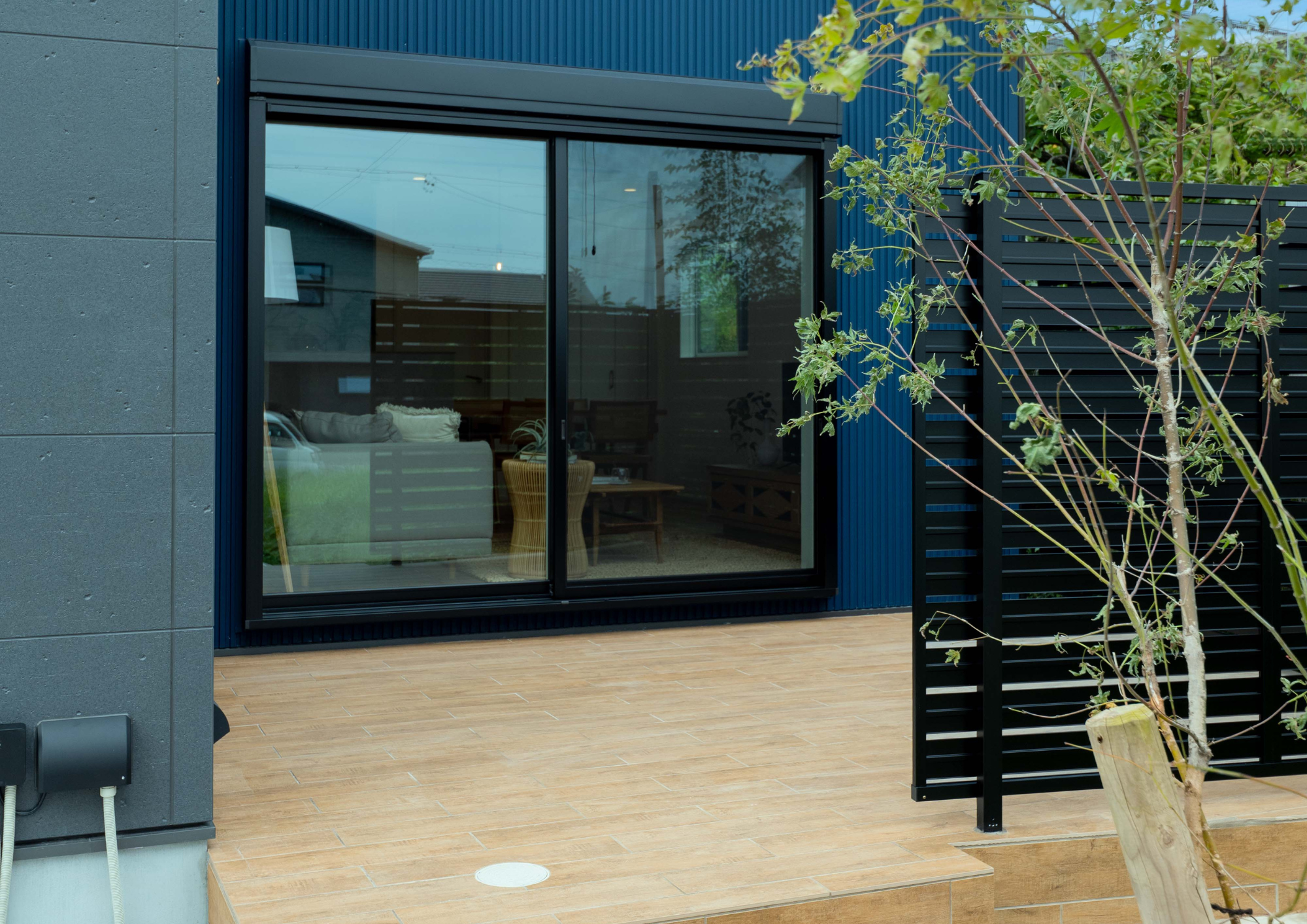 直線的でモダンな外観に、木の質感がやさしく映える。