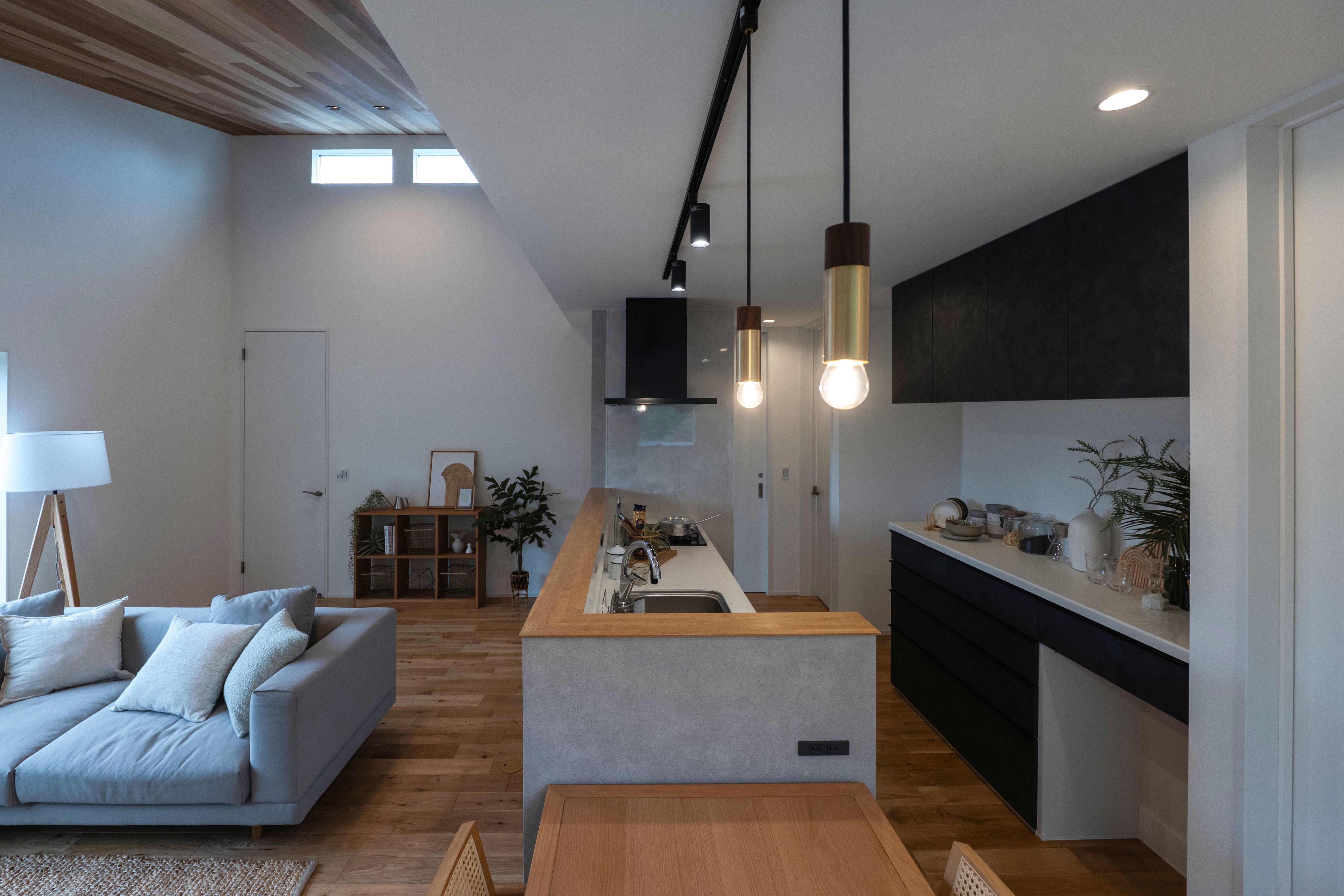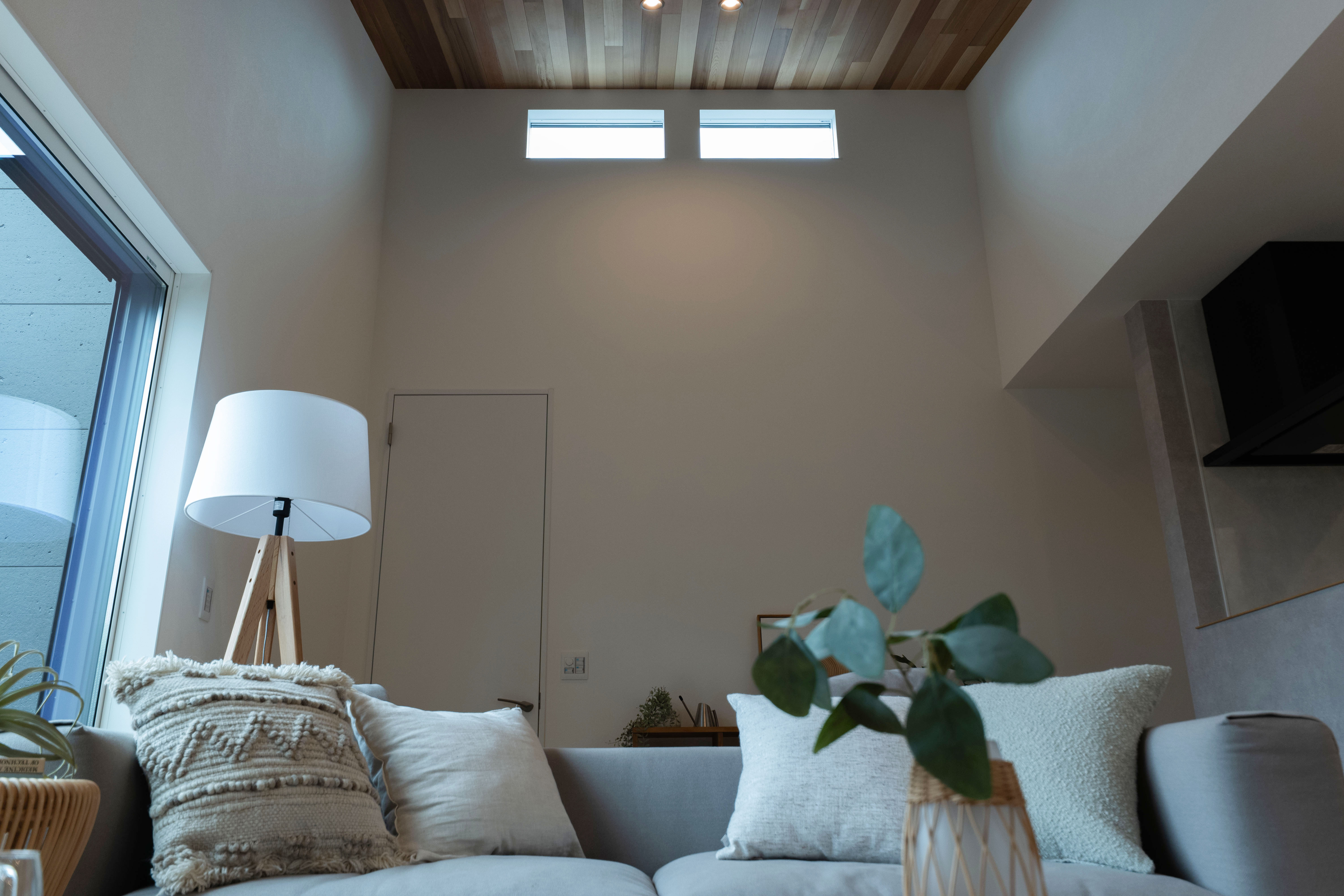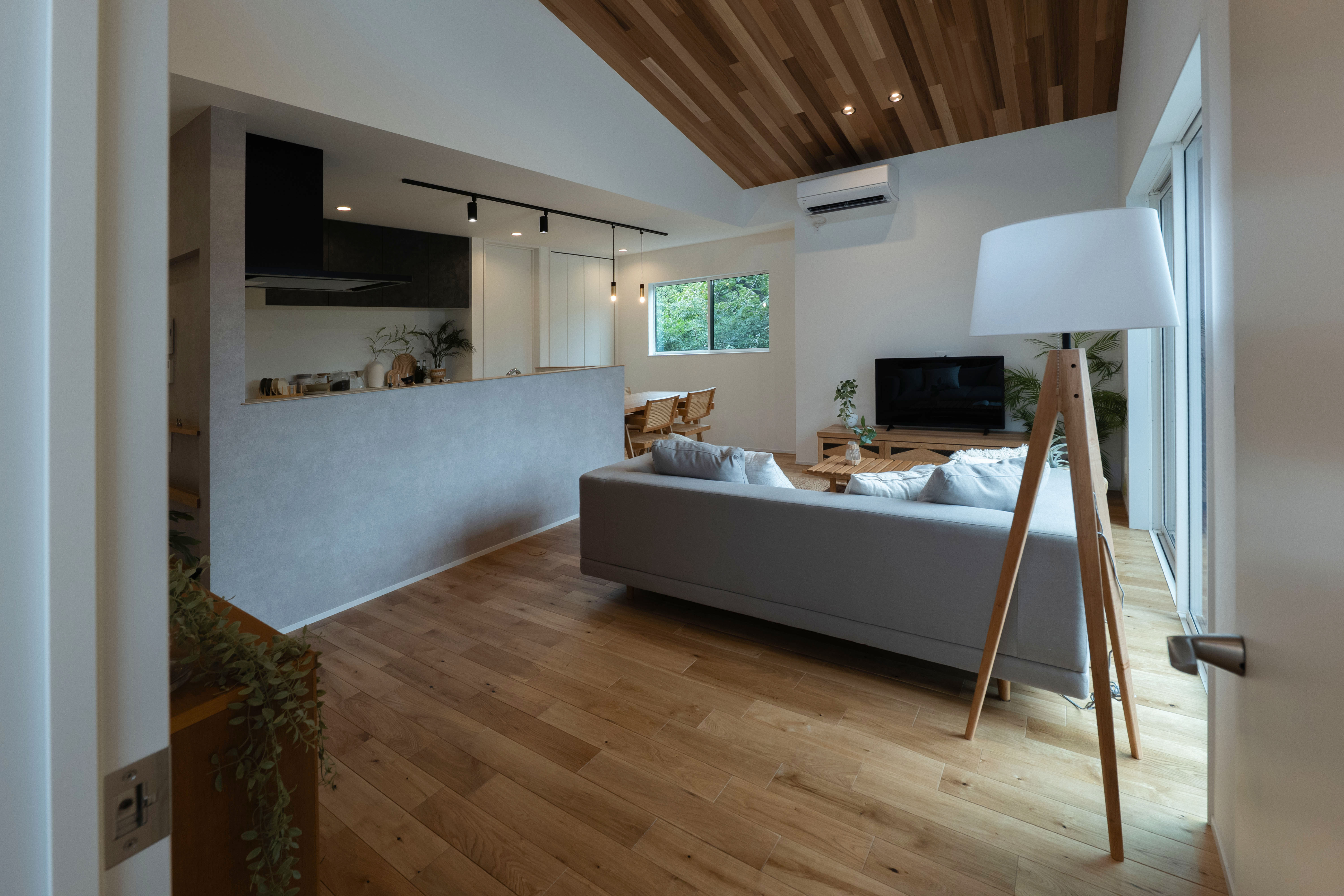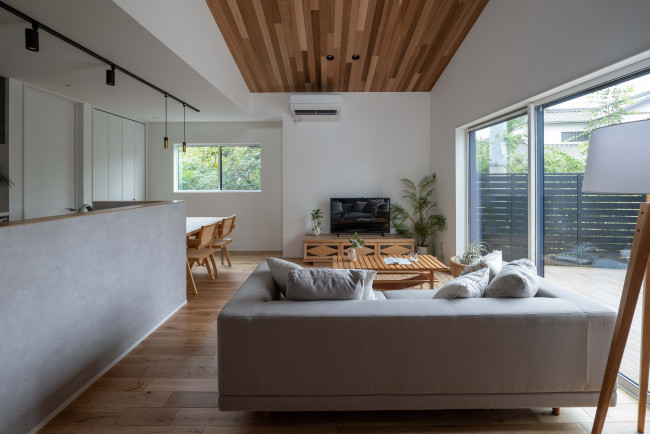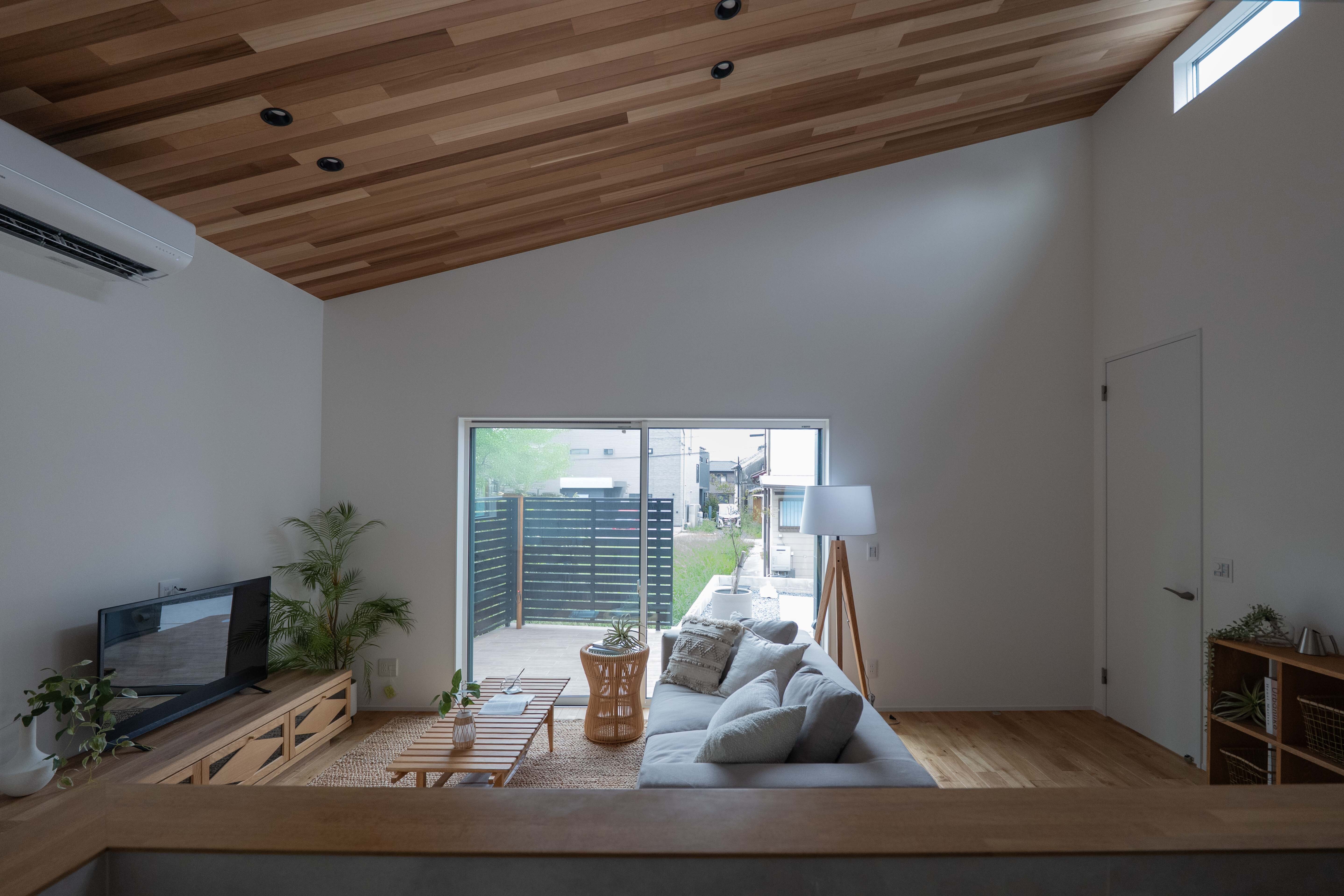 勾配天井にレッドシダーが映える、開放感あふれる19畳のLDK。