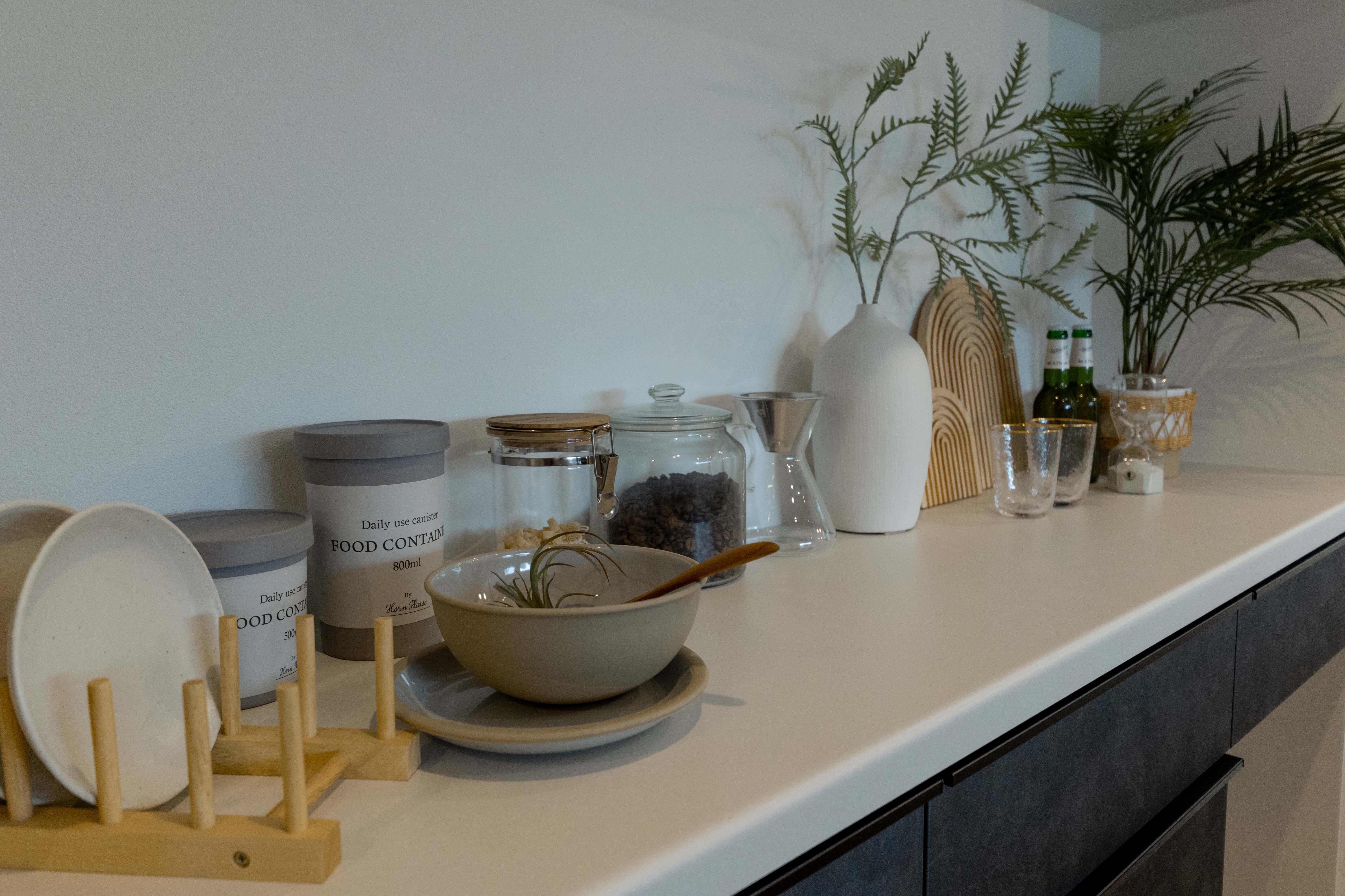たっぷり収納のカップボードは、見た目も美しく整理整頓をサポート。