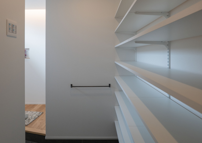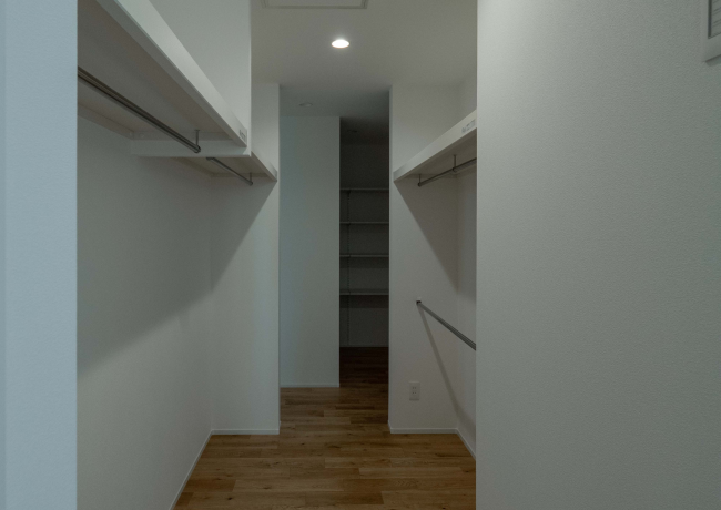 家族全員の衣類をまとめて収納でき、ランドリールームが横にあるため片付け動線もスムーズ。シンプルながら使いやすさを極めた設計。
