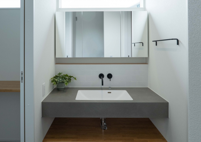 グレーのカウンターとホワイトタイルが美しく調和するオリジナル洗面。
