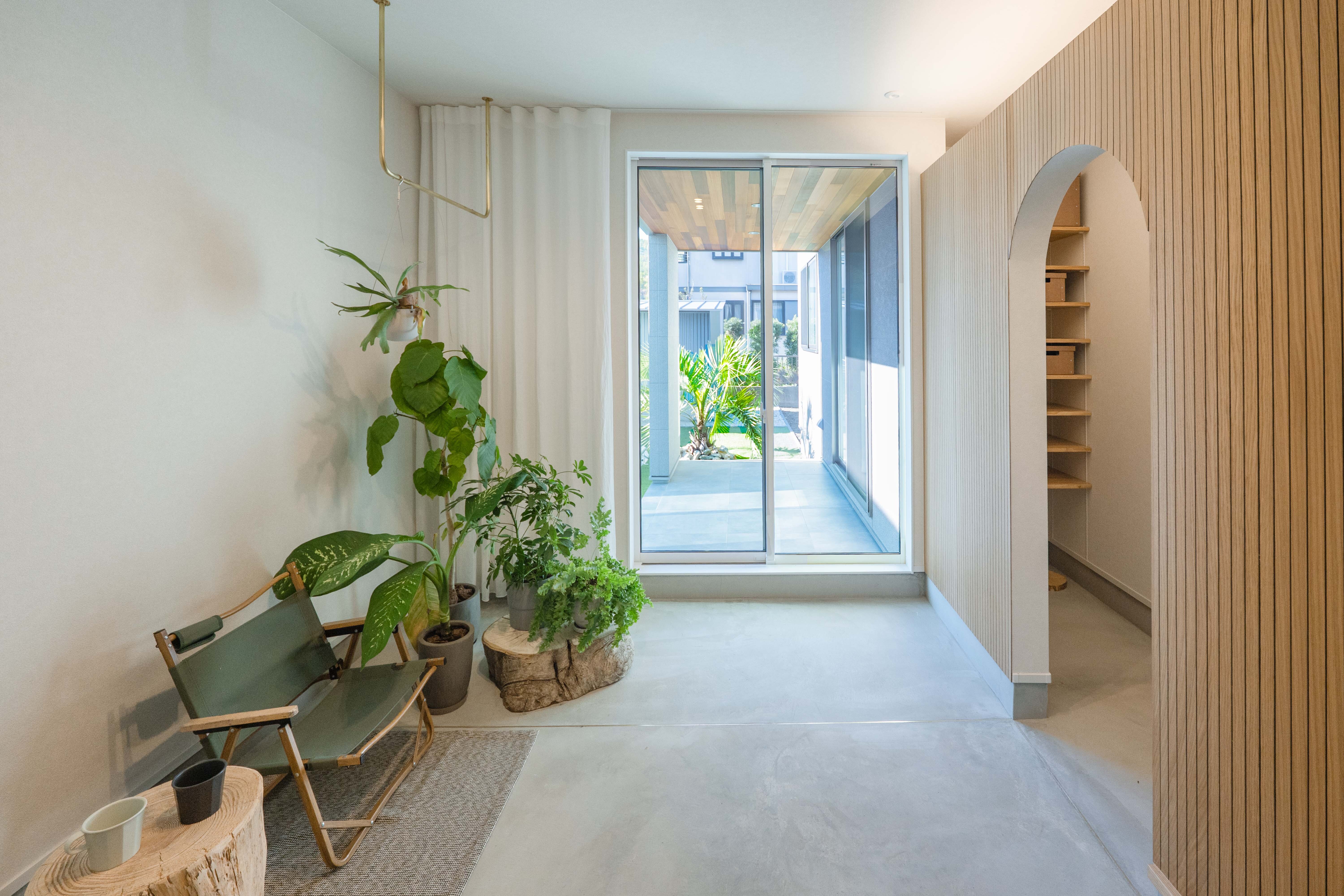 内と外をゆるやかに繋ぐ、リゾートスタイルならではの多目的土間です。