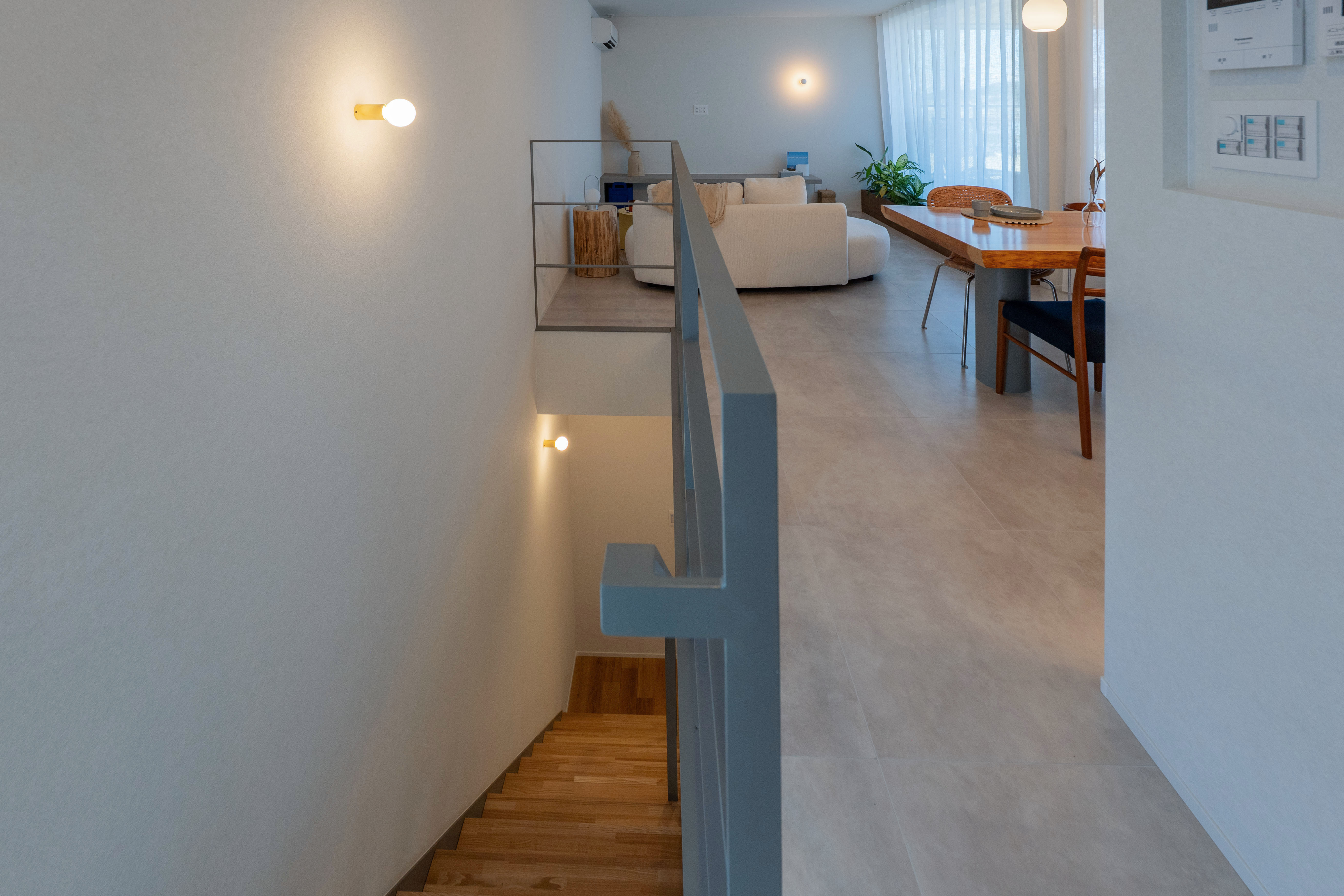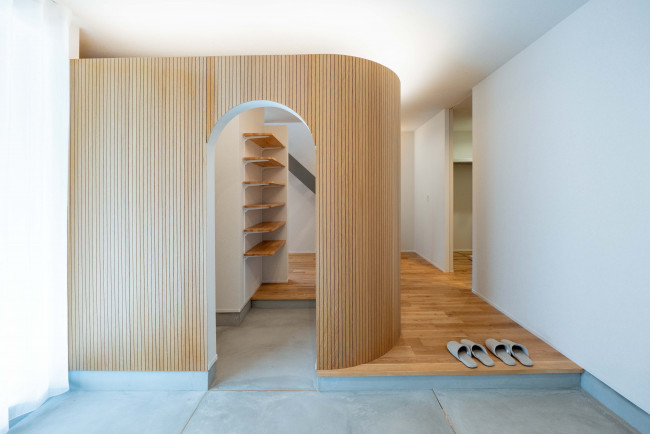 柔らかな曲線が空間に奥行きと温もりを与え、玄関から特別感を演出します。
