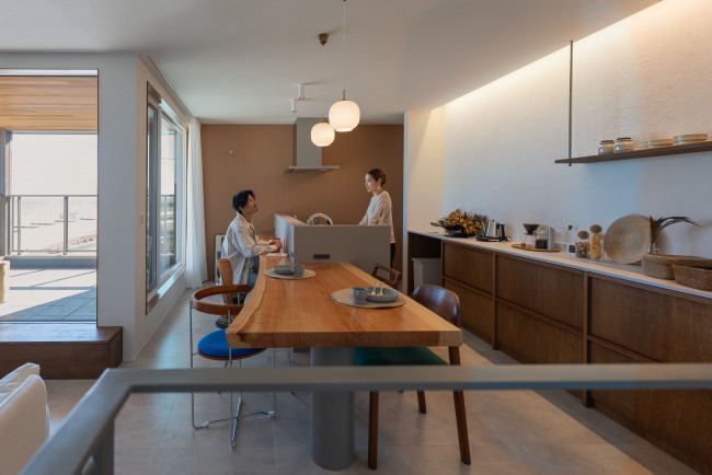 一枚板のカウンターとダイニングテーブルが主役のキッチン空間。